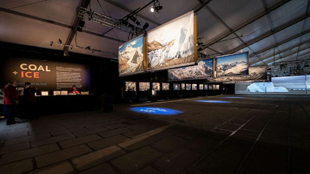 (WASHINGTON) — A man submerged up to his chin in brown, murky floodwaters and a group of miners covered head to toe in black soot — these are a few of the images featured at a new climate-inspired photography exhibit at the Kennedy Center called Coal + Ice, which opened on March 15.