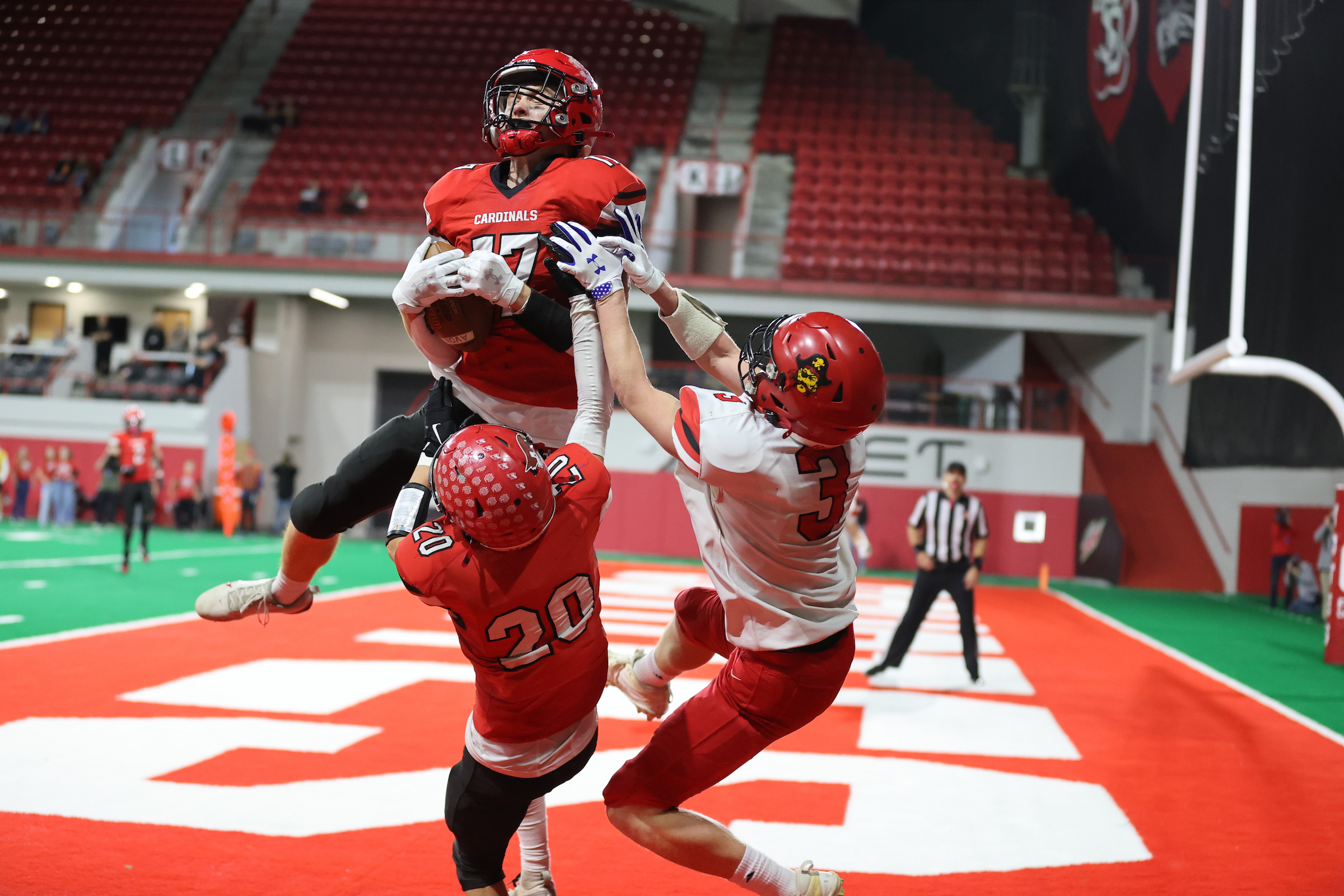 Sparked by a 30-point first quarter and a dominant two-way performance from senior star Lincoln LeBrun, St. Mary’s rolled to a 54-6 victory over Avon in the Class 9B state championship game Thursday at the DakotaDome. The win delivered the Cardinals their second football state title in school history and their first-ever undefeated season, finishing 12-0.