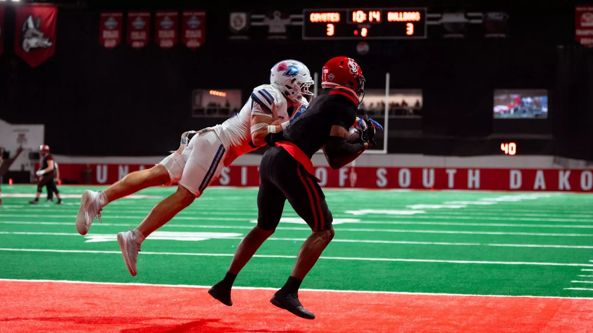 The second quarter would begin to see things turn in favor of the Coyotes, as USD outscored Drake 14-7 in the second quarter to hold a touchdown lead at the break. The first touchdown of the day came early in the second quarter, when Aidan Bouman would find Larenzo Fenner from 23 yards out to make it 10-7.