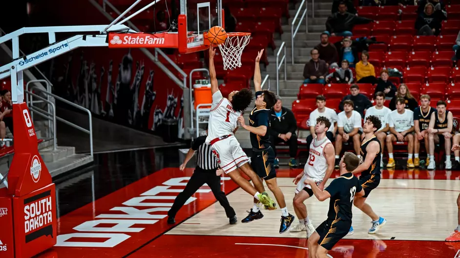 The Lancers held their own early in the contest as the lead would change hands on three occasions in the first 10 minutes with Mount Marty holding a five-point edge at the 12-minute mark, 17-12. The Yotes answered with nine straight points, six from Fens, as they pulled ahead 21-17 and would stay out in front for the rest of the contest. Back-to-back triples from Vince Buzelis and Evan Anderson, and a pair of free throws from Bruns, gave USD its largest lead of the first half (11) 39-28 with three minutes to go. Fens corralled his only missed shot of the day and his put back was good with seconds remaining to send South Dakota to the halftime break with a 43-33 advantage.